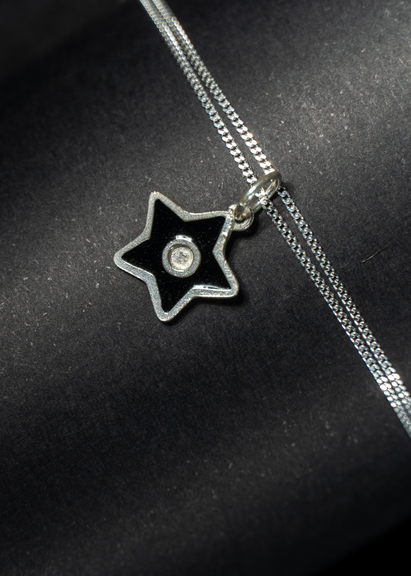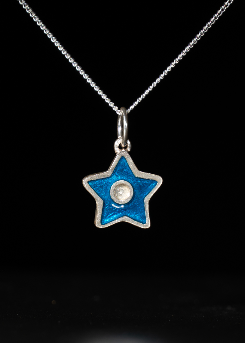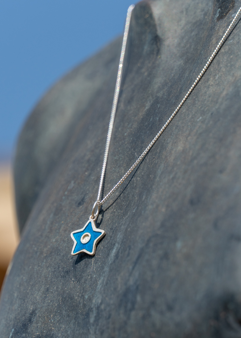 Este colgante artesanal presenta una estrella de 14 mm de diámetro, elaborada en Plata de Ley 925 y esmaltada en vibrantes colores. La acompaña una cadena de plata, que aporta brillo y un ajuste cómodo al cuello. Puedes elegir la longitud de la cadena entre 40 cm, 45 cm y 50 cm. Hecho a mano en Menorca, resistente al agua y con un diseño que une tradición y estilo, este colgante es una joya versátil pensada para acompañarte cada día.