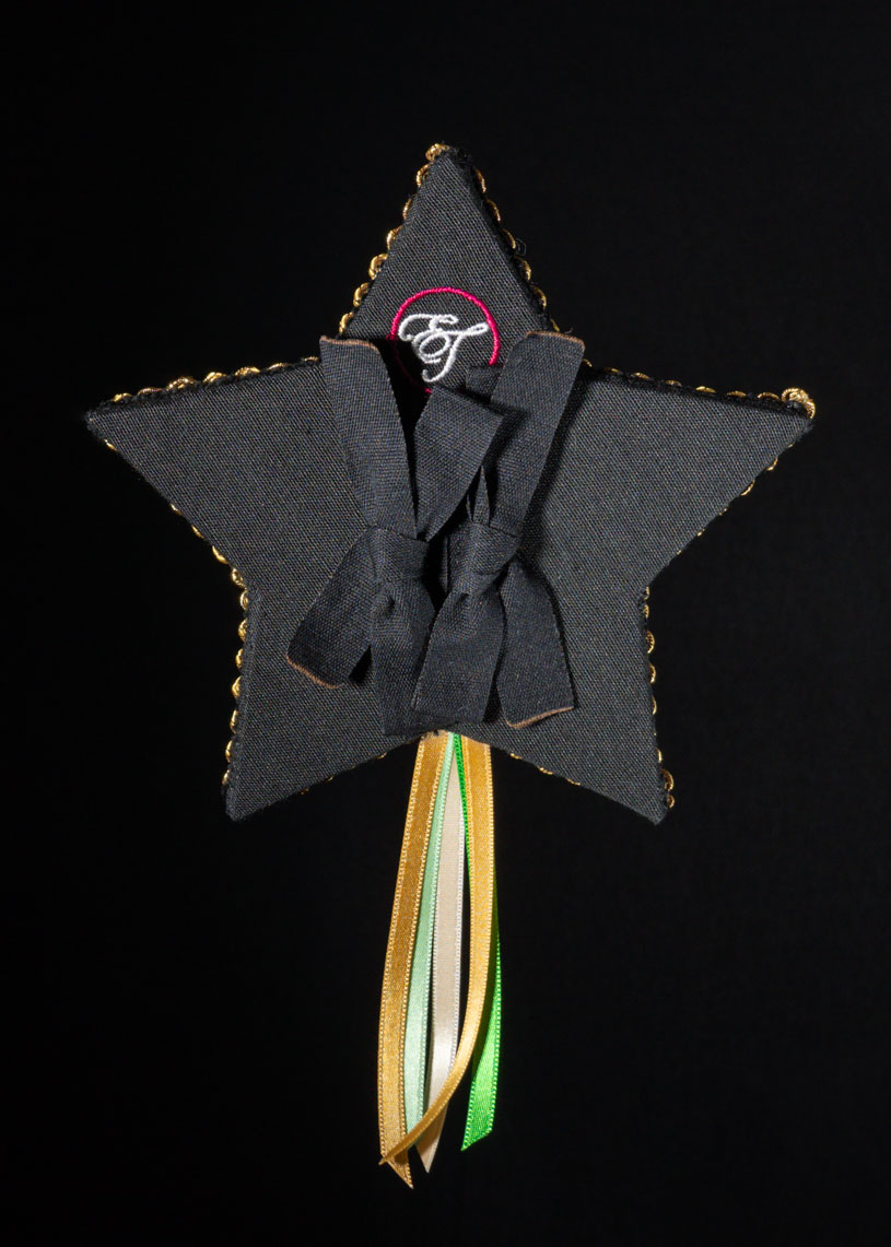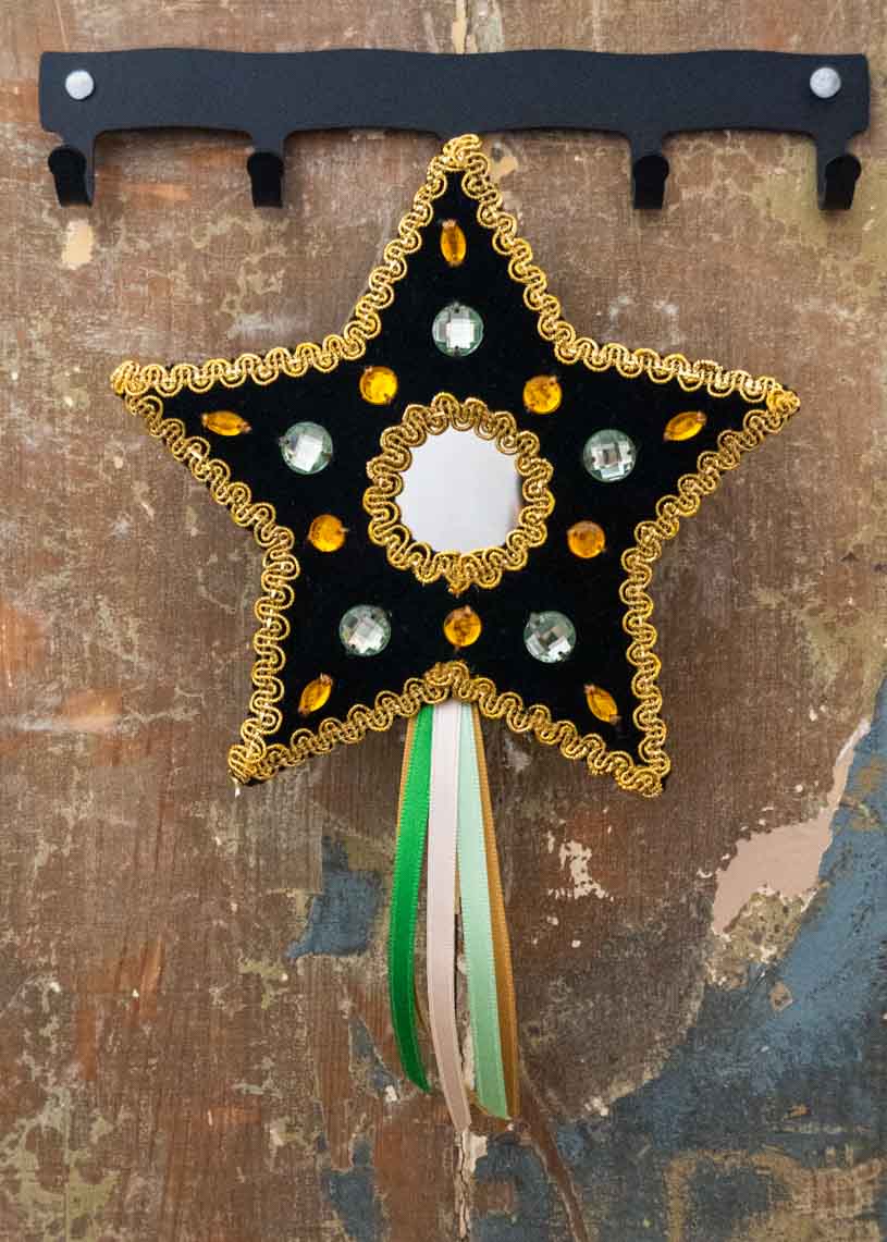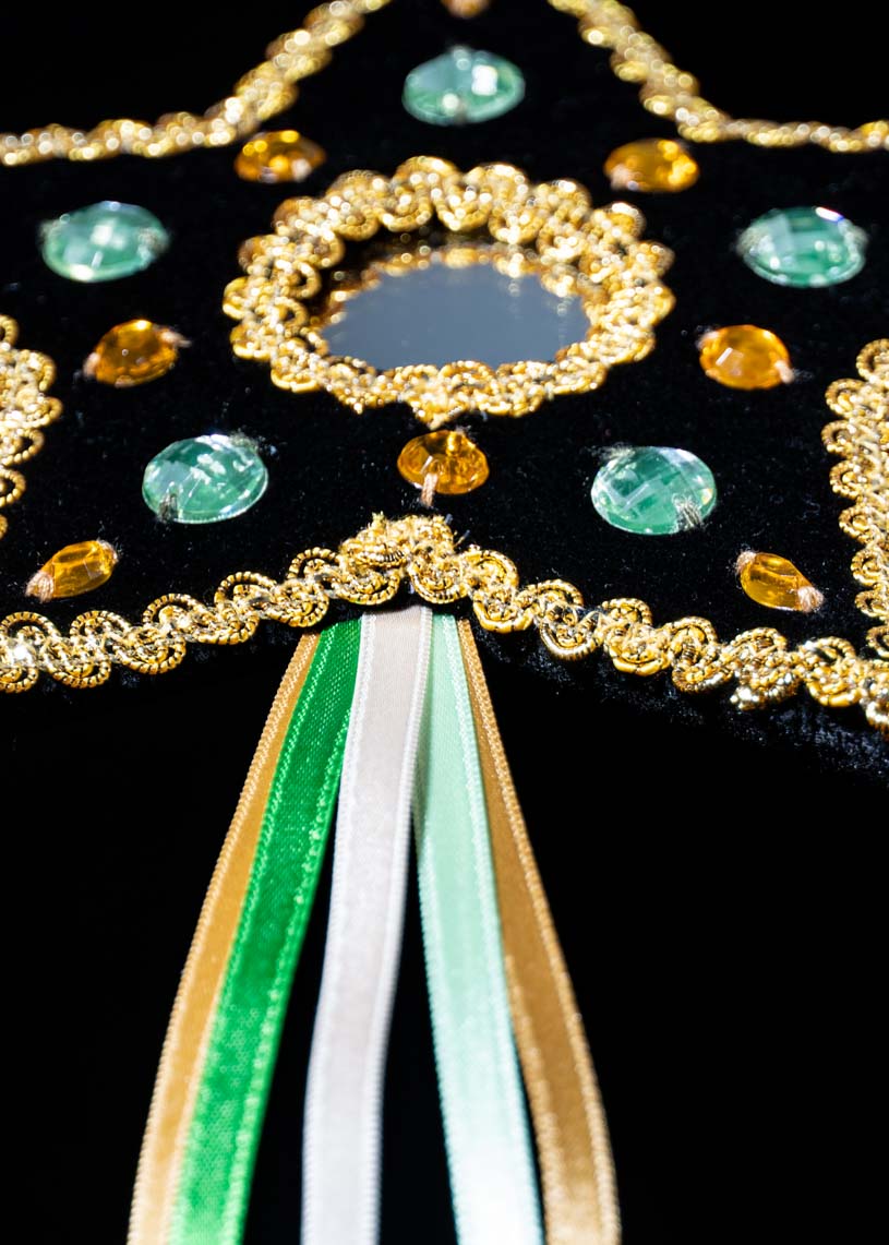 El Estel dorado con piedras verdes es una pieza artesanal con forma de estrella de cinco puntas, elaborada sobre una base de terciopelo negro. Su contorno está realzado con galón dorado, que perfila y embellece su silueta con elegancia. En el centro, un pequeño espejo circular, también enmarcado con galón dorado, está rodeado de pedrería en tonos verde y ámbar que aportan luz, contraste y profundidad a su diseño.